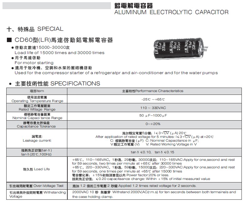 產(chǎn)品說(shuō)明:尺寸: AC33 額定電壓: 330V 標(biāo)準(zhǔn)容量: 120μF 介質(zhì)材料: PVC 誤差: ±10% 溫度: 其他