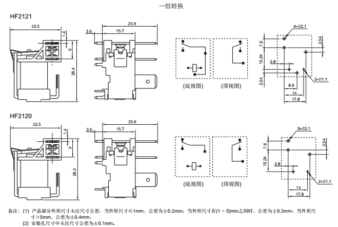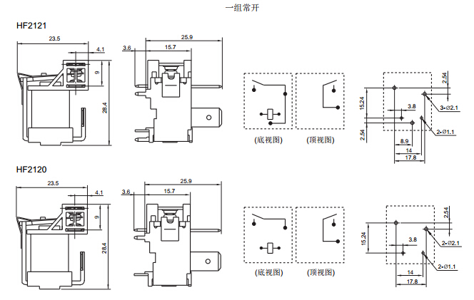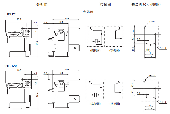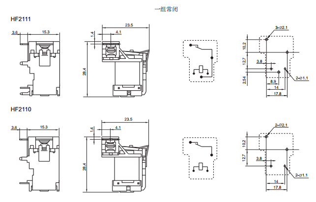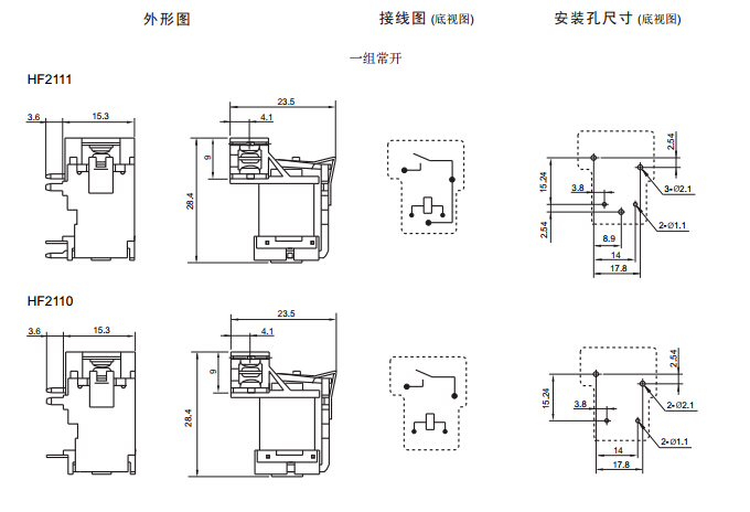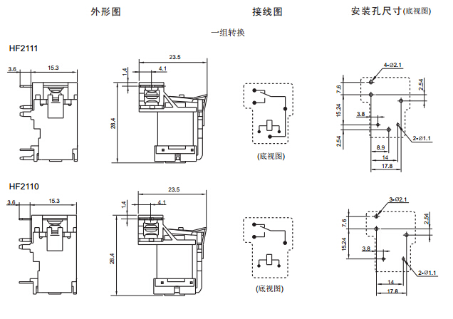 · 外形尺寸:(HF2110) (28.4 x 23.5 x 15.3) mm