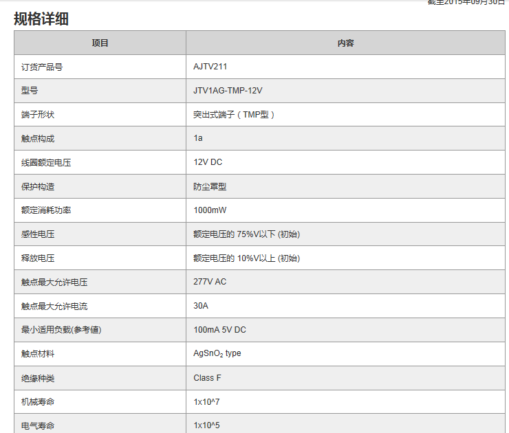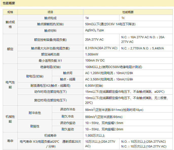 產品說明:1. 耐浪涌電壓6kV的高耐壓設計 高耐壓6kV耐浪涌型,觸點-線圈間耐電壓可達AC3,500V/1分鐘以上。 2. 可以實現30A(1a)通斷的高容量設計 最大通斷能力30A 277V AC(1a)適合高負載用。 3. 備有印刷電路板型和TMP型和塑料密封箱、防塵型。 4. 絕緣種類為F種。