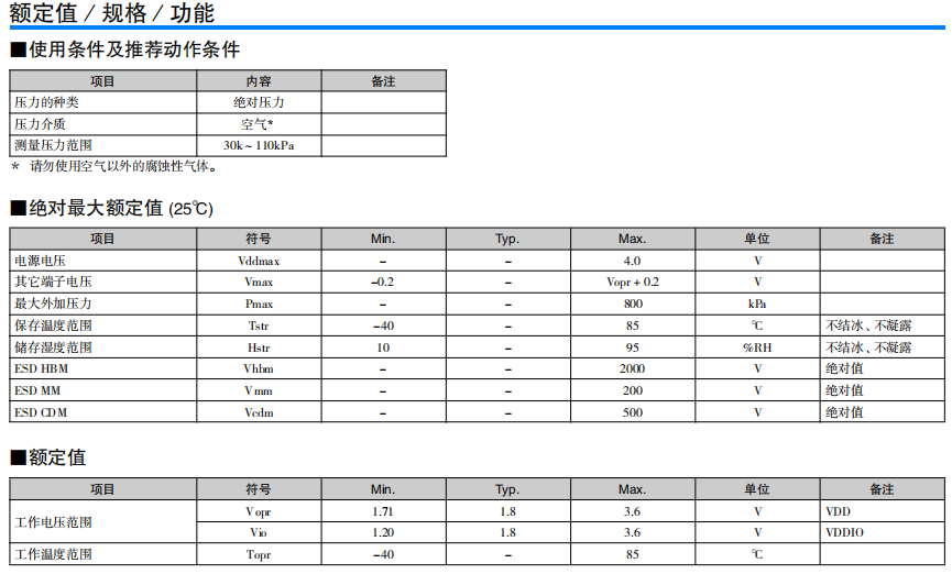 產品說明:高精度·低消耗電流的小型MEMS絕對壓力傳感器 高精度地測量氣壓 內置低干擾的24bit ADC 基于I2C/SPI 接口的數字控制/輸出 在自動睡眠模式下實現低消耗電流 單獨的補償系數保存在OTP*中 (* One Time Programmable - ROM)