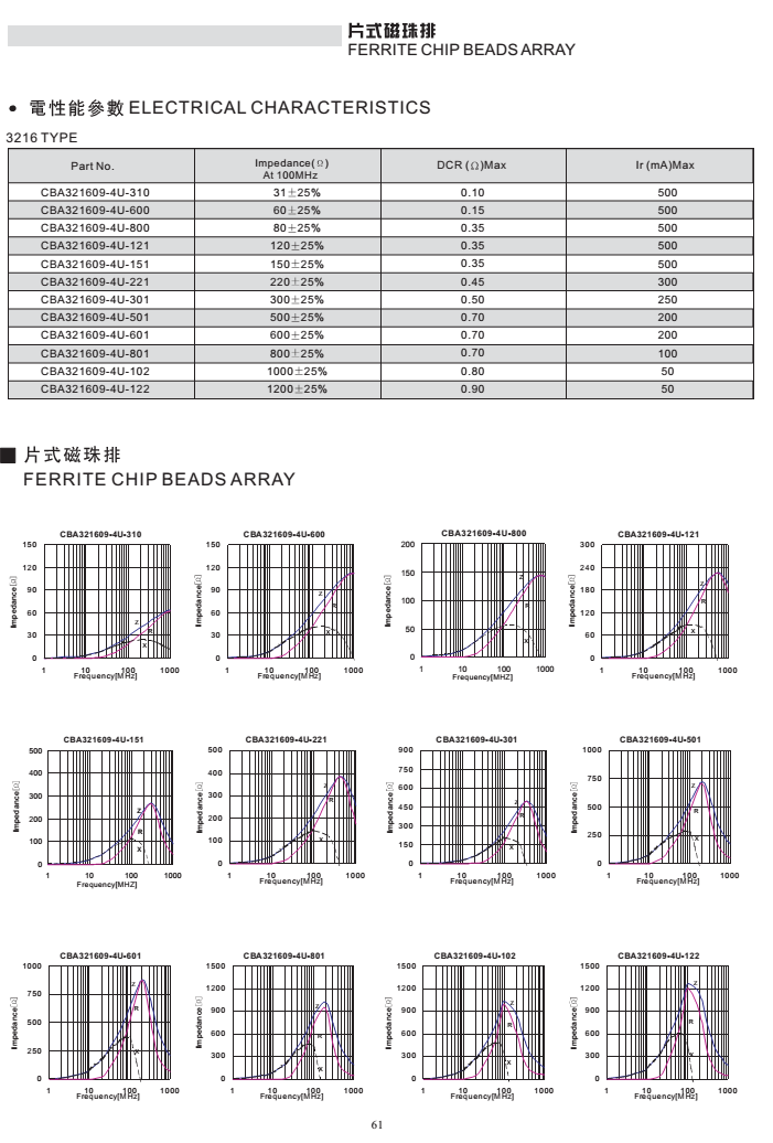 特征: 同尺寸下集多個磁珠于一體,適合于更高密度、更高效率的表面貼裝。 在較寬頻率范圍內(nèi)具有優(yōu)秀的阻抗頻率特性,對各種噪聲提供優(yōu)良的抑制。 獨(dú)石設(shè)計,將漏磁、鄰近回路串?dāng)_減至最小。 應(yīng)用于回流焊、波峰焊。 應(yīng)用: 應(yīng)用在HDTV、計算機(jī)I/O線、液晶顯示器外圍總線、打印機(jī)、傳真機(jī)等。