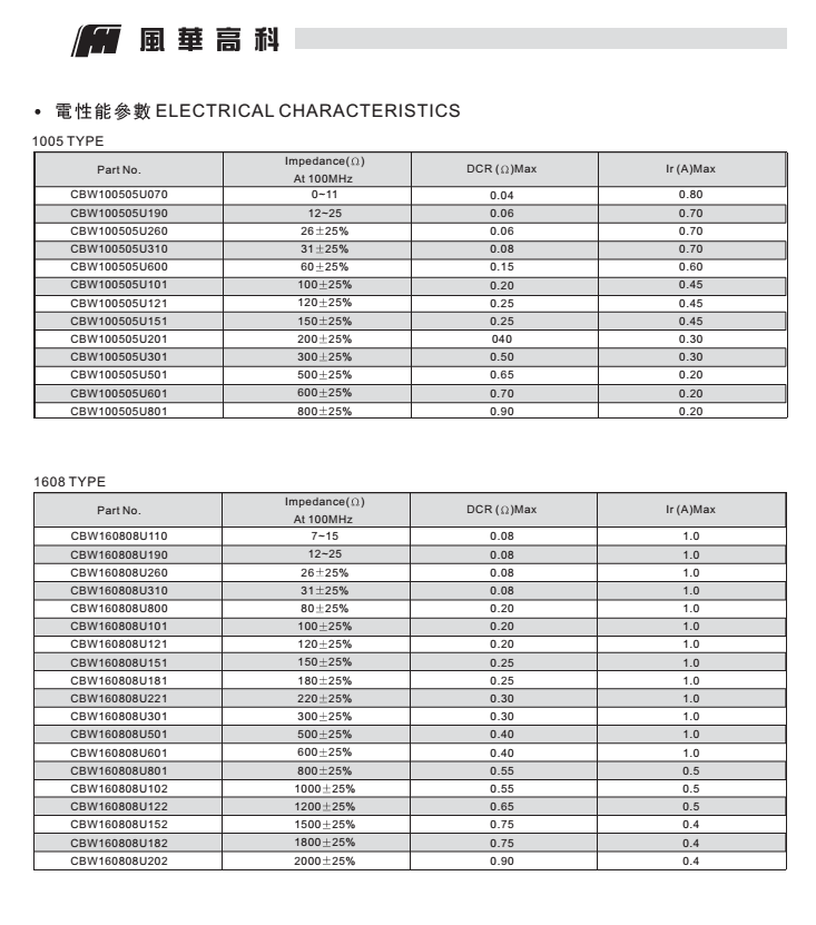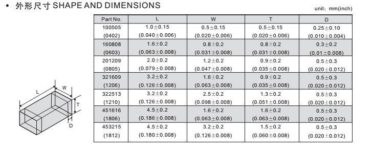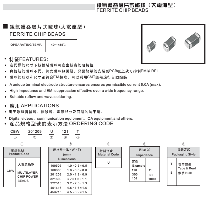 鐵氧體疊層片式磁珠(CBW) 特征: 在同樣的尺寸下較插裝磁珠可產生較高的阻抗值 與傳統的磁珠不同,片式磁珠無引線,只要簡單的安裝到PCB板上就可抑制EMI和RFI 磁珠的形狀和尺寸都符合EIA標準,可以利用SMT設備進行自動貼裝 應用: 用于數據傳輸線、信號線、電源部分及回路的抗干擾。