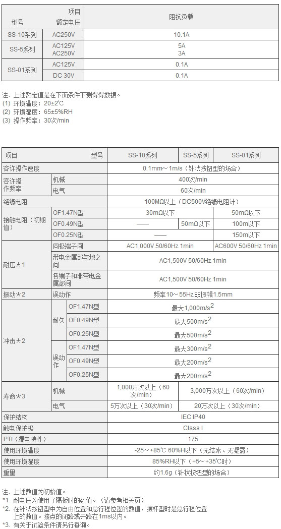 產品說明:超高安全而又可靠的超小型基本開關 ? 備有0.1A~10.1A型的各個品種,產品規格齊全,是歐姆龍最暢銷的開關。 ? 動作力規格滿足從低負載動作到高負載動作的各種用途,品種豐富。 ? 采用簡單穩定的分割2片彈簧,實現了3,000萬次的長壽命。