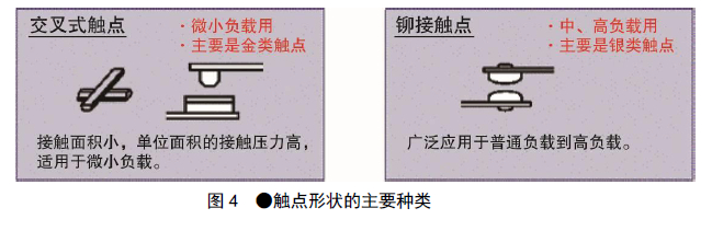 是微動開關的心臟部分,通過觸點進行電路的ON/OFF。根據ON/OFF的電壓及電流,采用不同的觸點材料及形狀。材料主要以金、銀及其合金以及金銀電鍍為主。形狀有交叉式觸點、鉚接觸點等。(圖4)