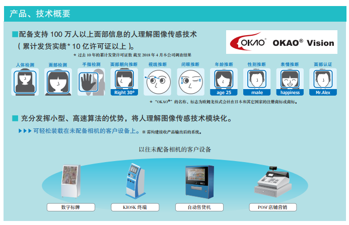 現在人工智能領域上有許多產品已是有用到人臉識別功能,而人臉識別已普遍應用在手機刷臉、刷臉考勤、人臉門禁、刷臉過關、人證比對等實際場景中。而人臉識別只是視覺AI 落地的開始,近期歐姆龍已經新研發了人臉視覺組件(HVC-P2) B5T-007001系列,現在我們為大家介紹下人臉視覺傳感器的功能: