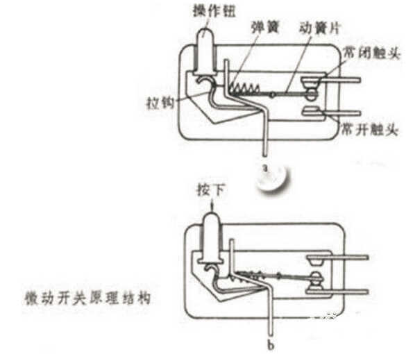 外機械力通過傳動元件(按銷、按鈕、杠桿、滾輪等)將力作用于動作簧片上,當動作簧片位移到臨界點時產生瞬時動作,使動作簧片末端的動觸點與定觸點快速接通或斷開。